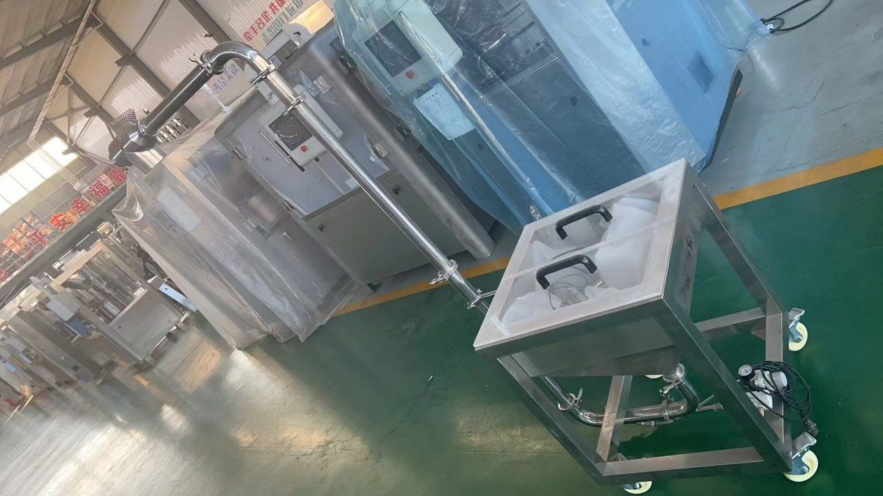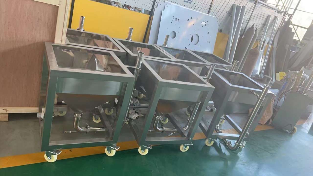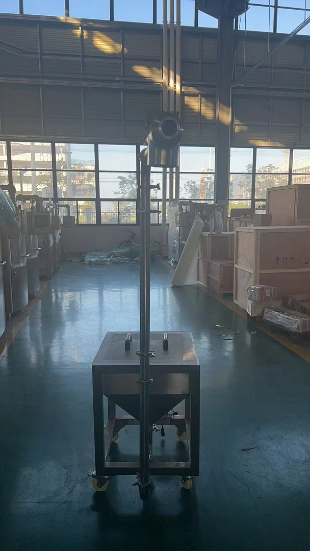 Оборудование для загрузки пустых капсул в капсулятор DA-S1200 поставлено на раму с колесами, то есть его удобно перемещать на объекте работ. Конструктивно – это ящик с верхней загрузкой, который имеет задвигающиеся крышки (в базовом варианте – сталь, по запросу – из прочного стекла для удобного визуального контроля). В донной части этого короба имеется отверстие, уводящее капсулы в U-образный, а далее в вертикальный канал (труба), на оконечности которого имеется сопло подачи.